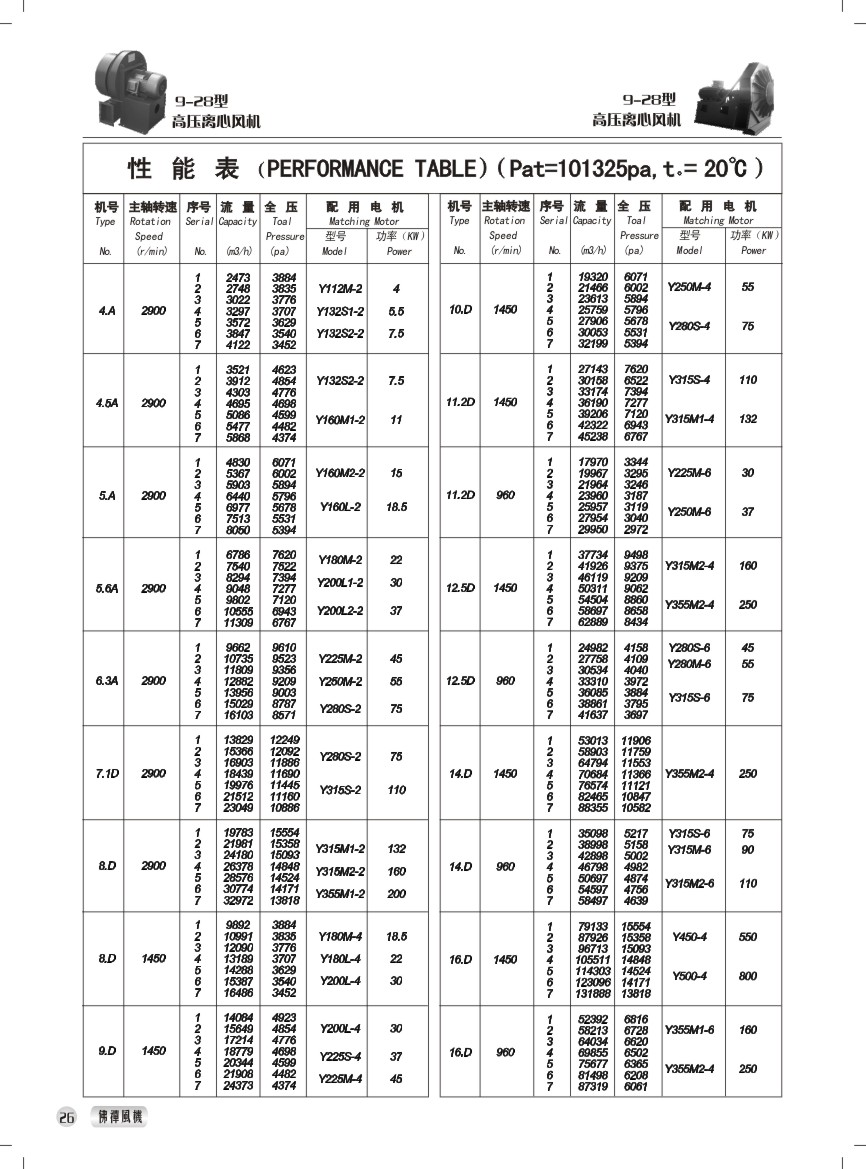 本公司生產(chǎn)的高壓離心 風(fēng)機有8-09型、9-12型 9-19型,9-20型、9-26型 9-28型、10-16型、10-24 型等型號。